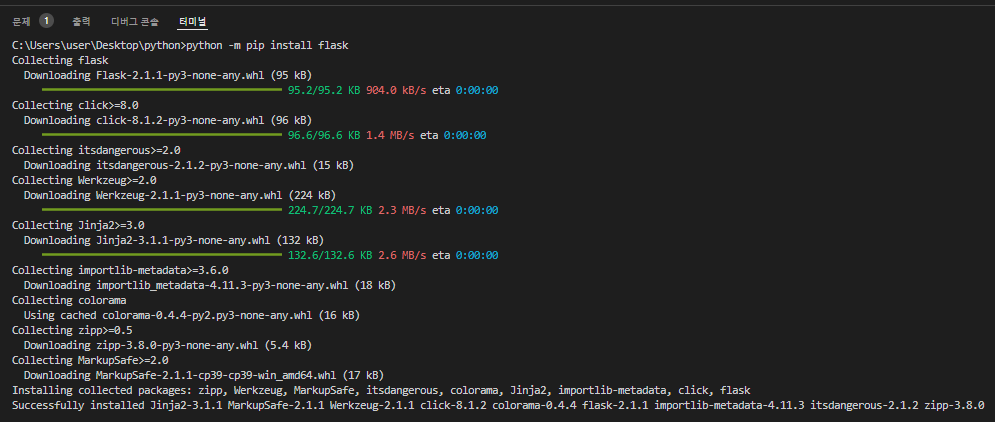 위의 명령어로 flask를 설치한다.